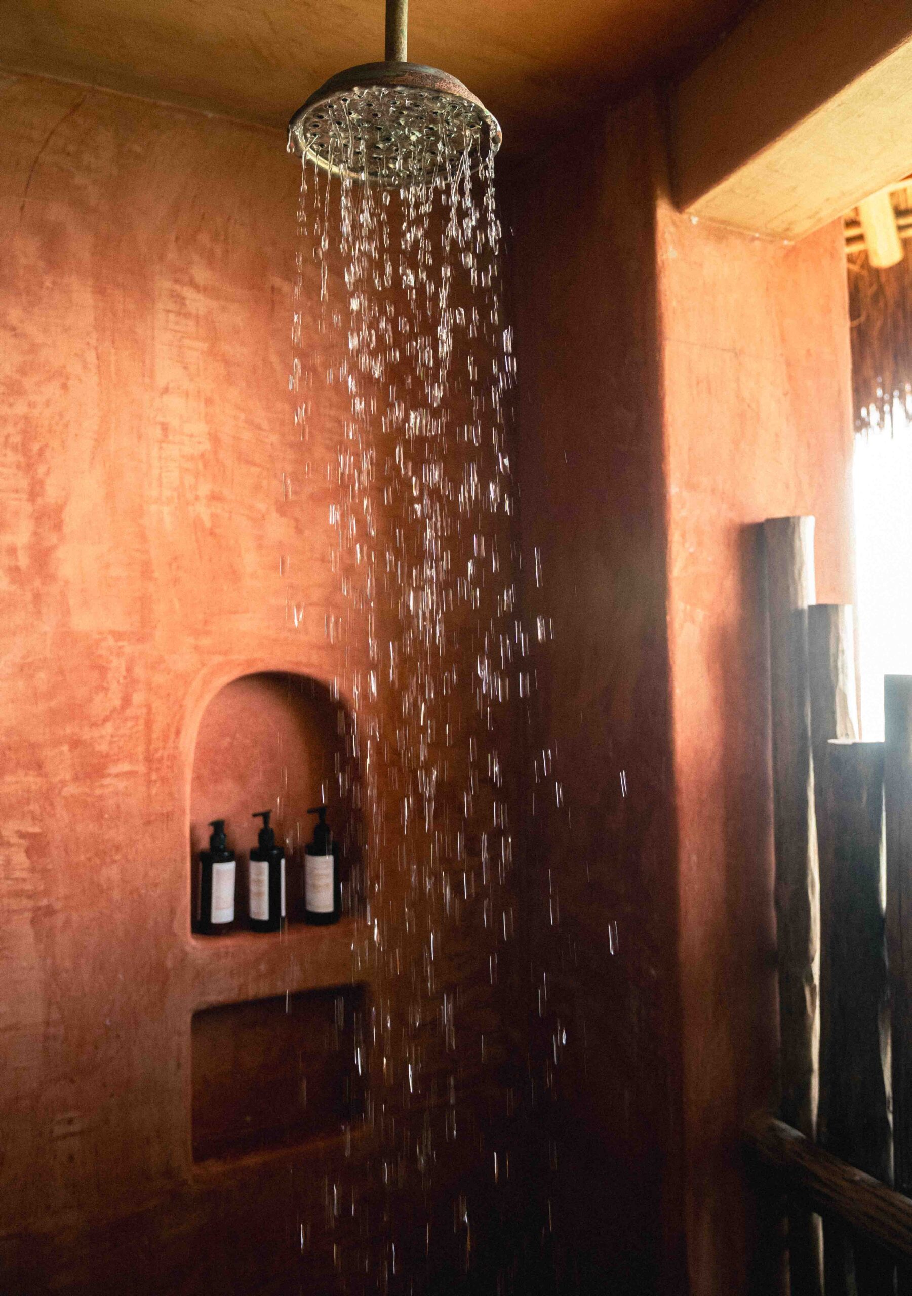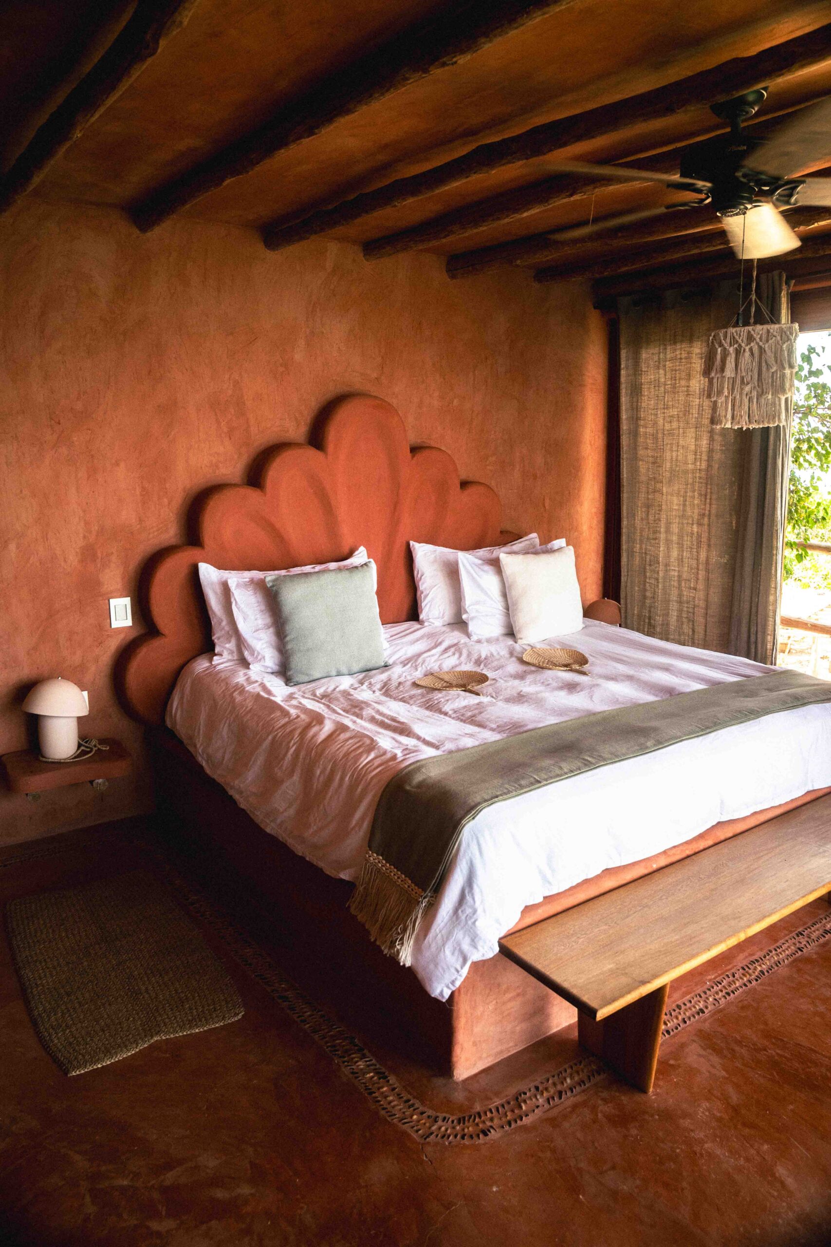 Located on the second floor, this 25 m² room offers double exposure: watch the sunrise and sunset without leaving your bed. It features a king-size bed, A/C, ceiling fan, high terracotta ceilings with wooden beams, and a bathroom with hot water and natural textures.