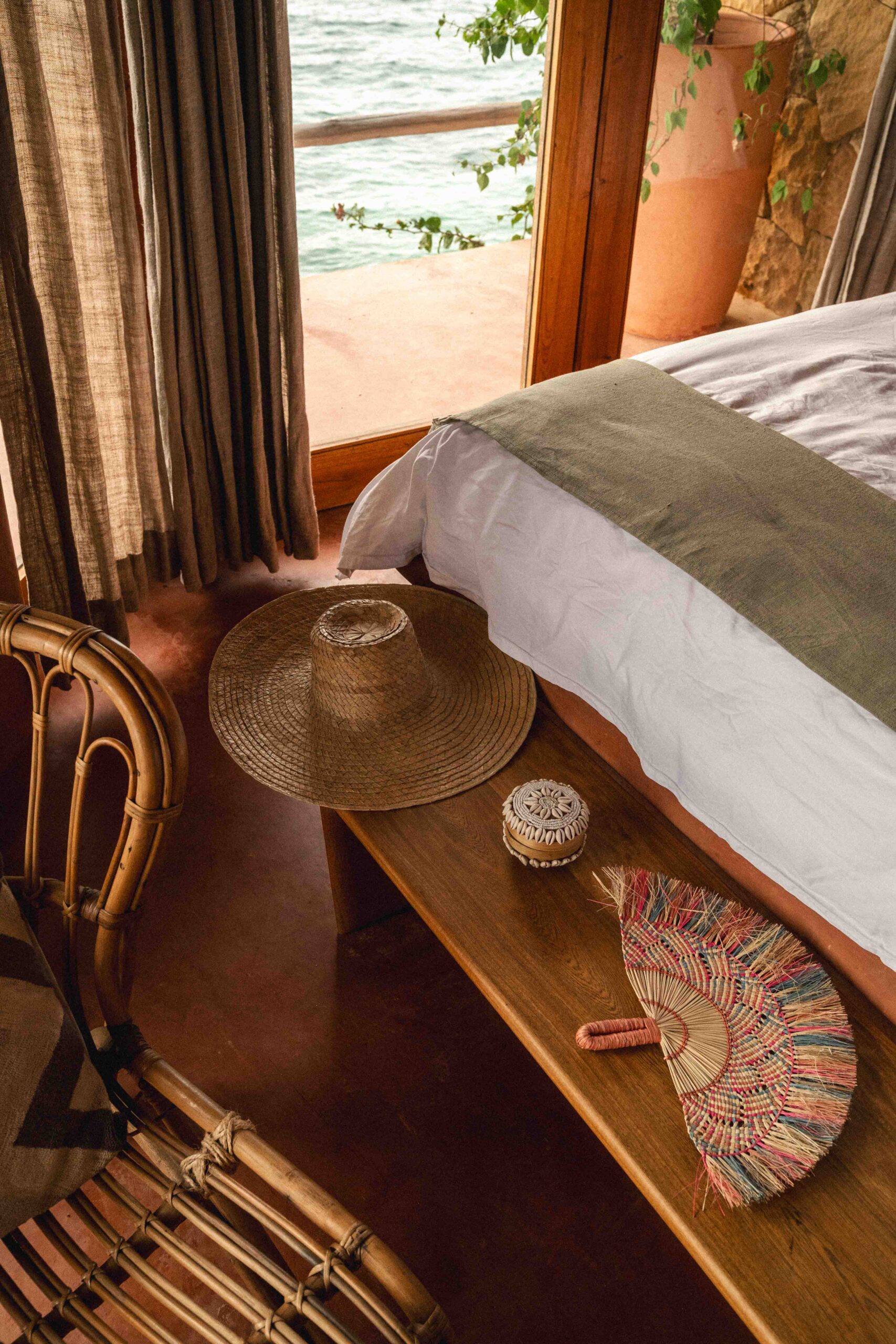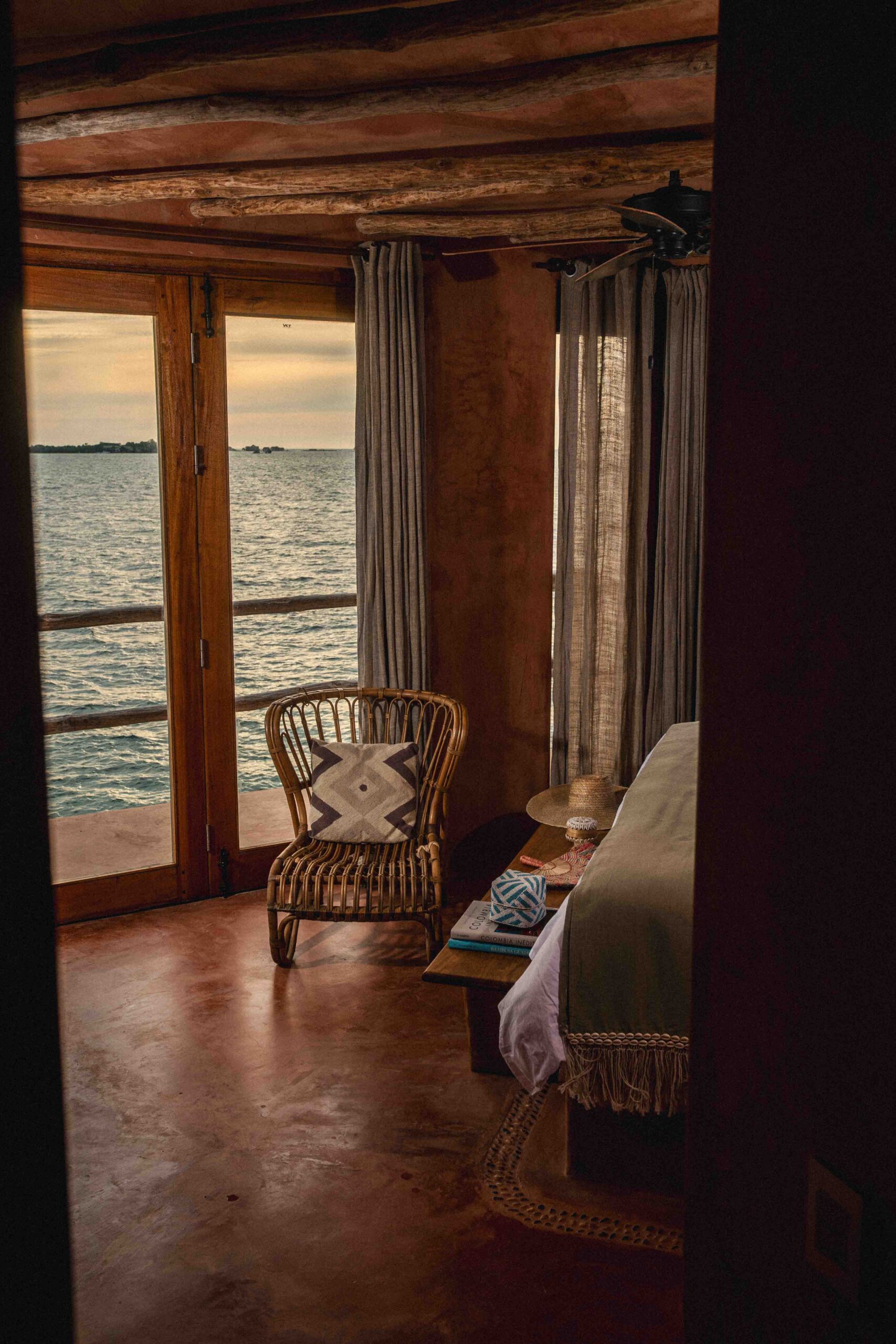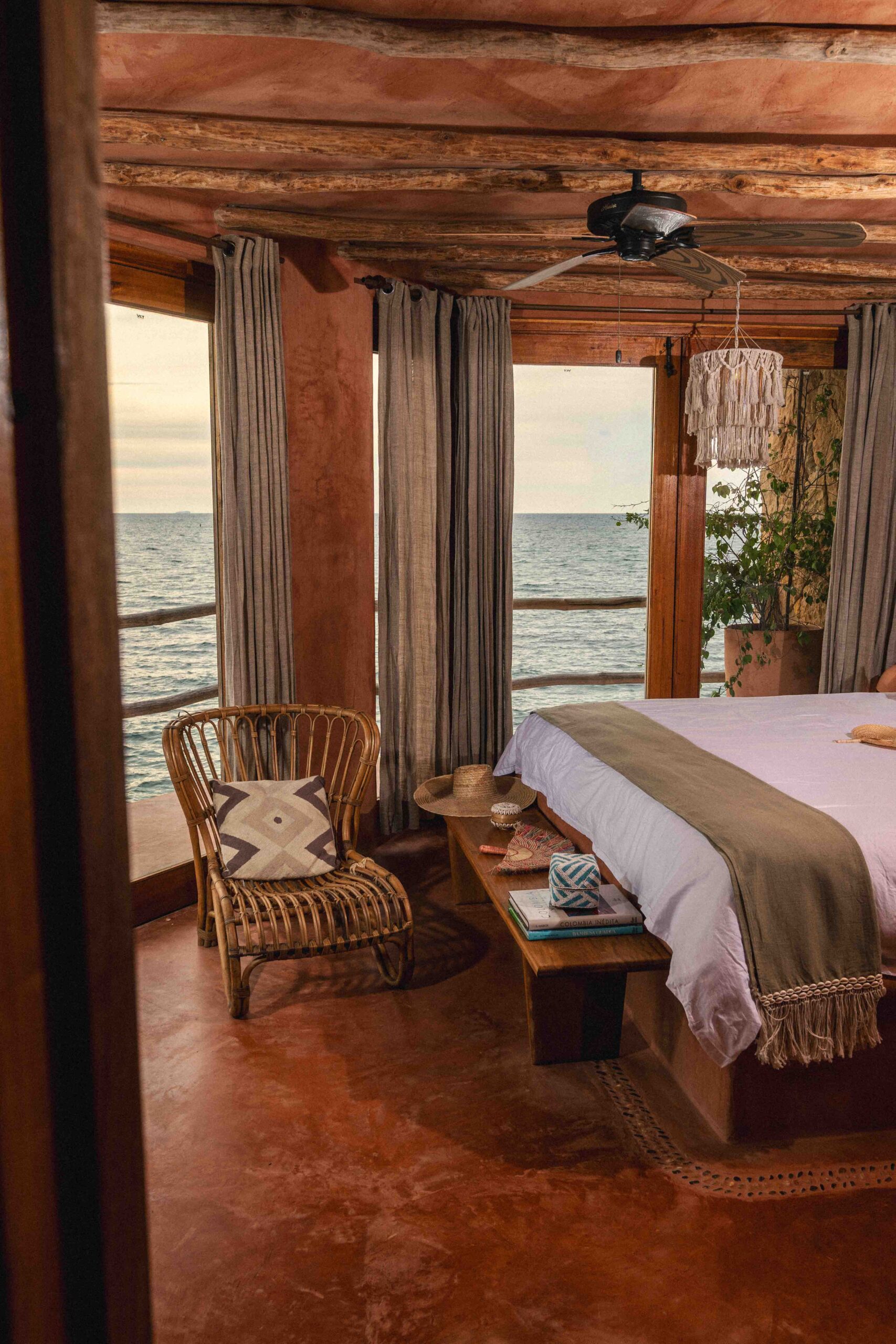 Warm, golden and designed for sunset lovers. This 25 m² room overlooks the Rosario Islands and offers a king-size bed, A/C, ceiling fan, and high ceilings in terracotta and wood. The artisanal bathroom is semi-open and features hot water and rustic finishes that embrace the simplicity of island life.